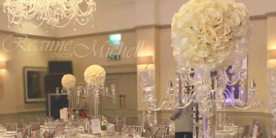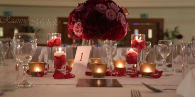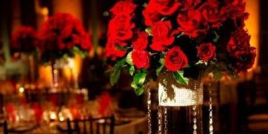 Stunning Fresh Red Rose Arrangements on tall Cylinder Vases with Hanging Crystals and Diamante Band