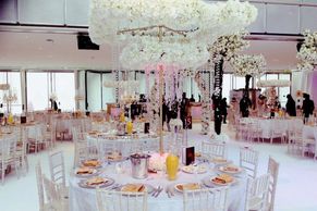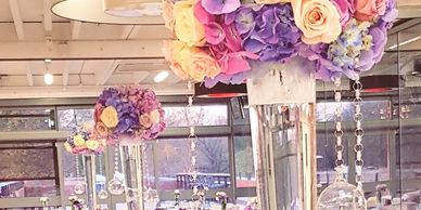 Tall Glass Cylinder Vases with Custom made Purple Fresh Flower Arrangements with Hanging Crystal Tea Lights